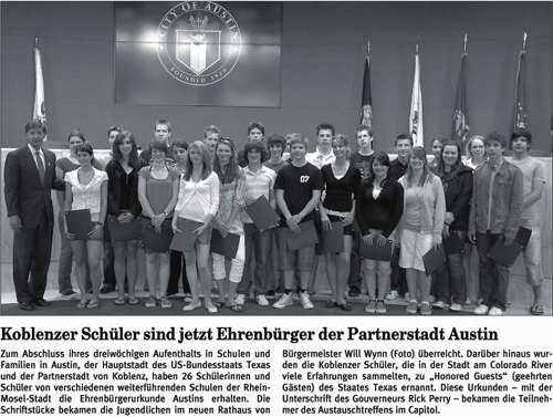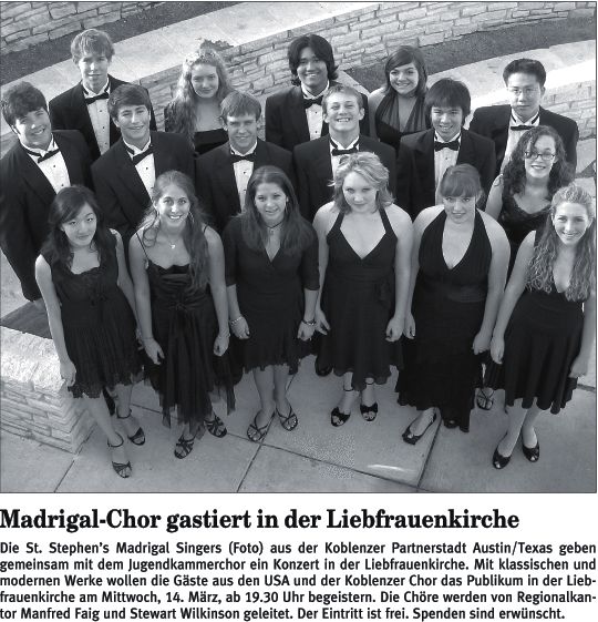 Die St. Stephen´s Madrigal Singers aus der Koblenzer Partnerstadt Austin unternehmen zurzeit eine Konzertreise in Deutschland und verbringen dabei auch zwei Tage in der Rhein-Mosel-Stadt. Gestern besuchten Sie auf Einladung von OB Dr. Eberhard Schulte-Wissermann das Rathaus. Abends dann gab der Chor mit der Mädchenkantorei und dem Jugendkammerchor der Liebfrauenkirche ein gemeinsames Konzert. Das Bild zeigt den Chor gemeinsam mit dem OB und Chorleiter Stewart Wikinson in der Mitte.