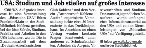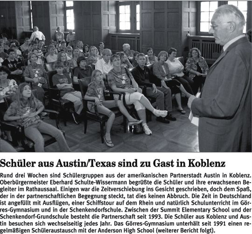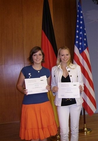 Im Rahmen der Feierlichkeiten zu > 25 Jahre GAPP – German American Partnership Program < im großen Saal des Auswärtigen Amtes in Berlin, überreichte Frau I.B. Eitze-Schütz, Leiterin des Pädagogischen Austauschdienstes der Kultusministerkonferenz, die Urkunden. Außerdem hatten die beiden Preisträgerinnen zusammen mit ihren Austauschlehrerinnen die Einladung erhalten, am Seminar “25 Jahre GAPP ” in Berlin vom 15. – 17. Juni 2008 teilzunehmen. Katharina und Nicole sind Freundinnen geworden, weil sie beide im Austauschprogramm der weiterführenden Schulen Koblenz-Austin teilgenommen haben und Austauschpartnerinnen waren.