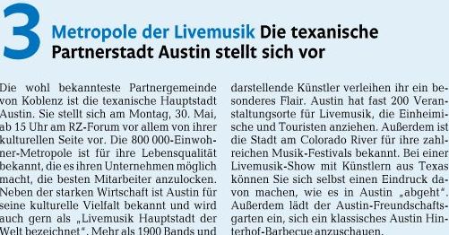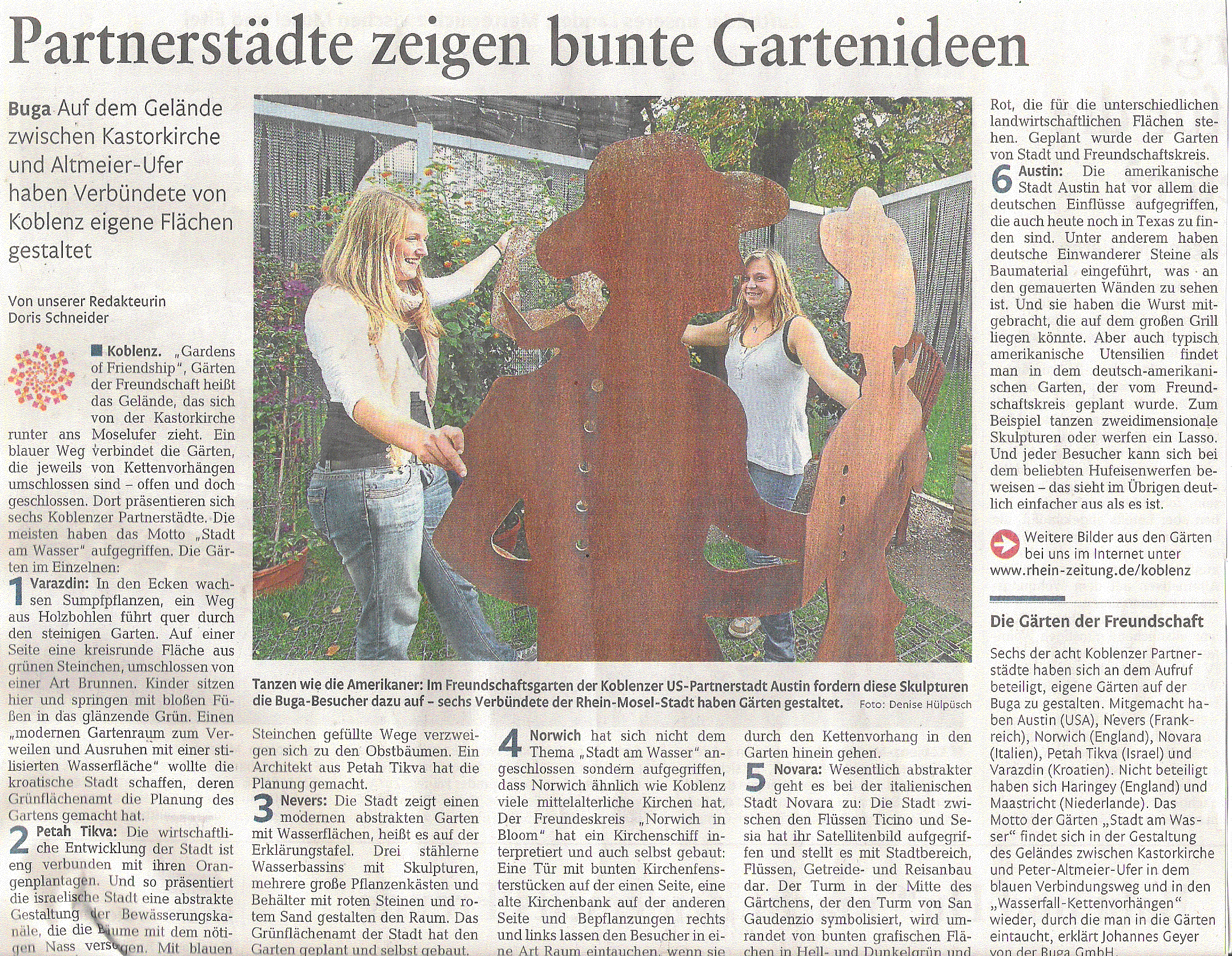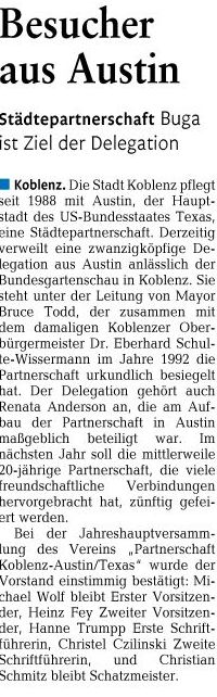 Die Bundesgartenschau war auch Thema des inhaltvollen und kenntnisreichen Vortrag des Leiters des Amtes für Wirtschaftsförderung der Stadt Koblenz, Jürgen Czielinski. Er berichtete aus erster Hand über seine Tätigkeit als erster Geschäftsführer der Buga-GmbH, deren Übergabe an Herrn Faas als neuen Geschäftsführer. Als besonderes Alleinstellungsmerkmal für Koblenz wies er darauf hin, dass fast alle BUGA-Flächen unbebaubar sind und daher jederzeit wieder für eine Gartenschau aktiviert werden könnten. (Welche Stadt hat diese Möglichkeit außer Koblenz, die Red.) Bemerkenswert war der weitere Hinweis, welche großen Verbesserungen ohne die BUGA nicht oder nicht so früh gekommen wären (Tiefgarage Schloßlplatz, Nutzung Schloß, Rheinpromenade etc.) Spannend war die Entwicklung zur Verwirklichung der Gondel-Seilbahn über den Rhein und die großen Hoffnungen zum Fortbestand derselben. Abschließend bot Jürgen Czielinski für Februar 2012 eine Führung nur für angemeldete Mitglieder und Gäste der Partnerschaft durch den neuen noch im Rohbau befindlichen Kulturbau am Zentralplatz. Der Termin wird auf dieser Seite noch mitgeteilt.