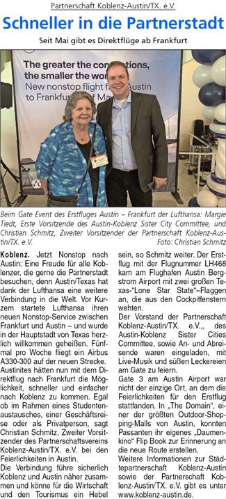 Margie Tiedt, 1. Vorsitzende des Austin-Koblenz Sistercity Committee, Christian Schmitz, 2. Vorsitzender der Partnerschaft Koblenz-Austin/TX. e.V.