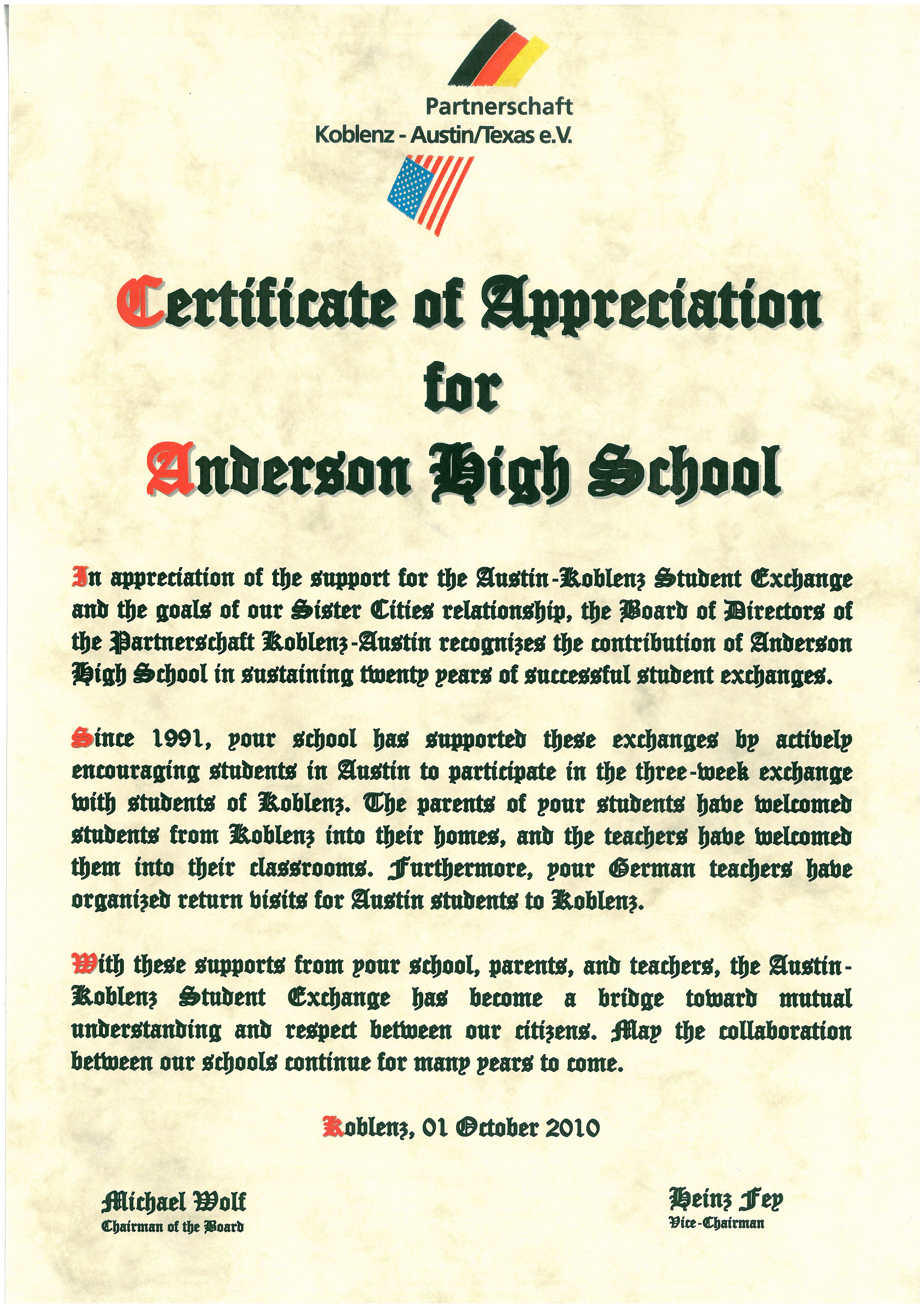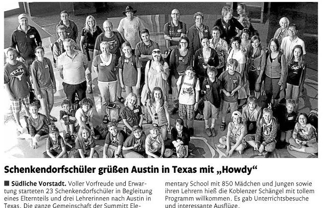 Schulaustausch der Partnerschaft mit Koblenzer Gymnasien und der Anderson High School in Austin sowie der Schenkendorfschule Koblenz und der Summit Elementary in Austin